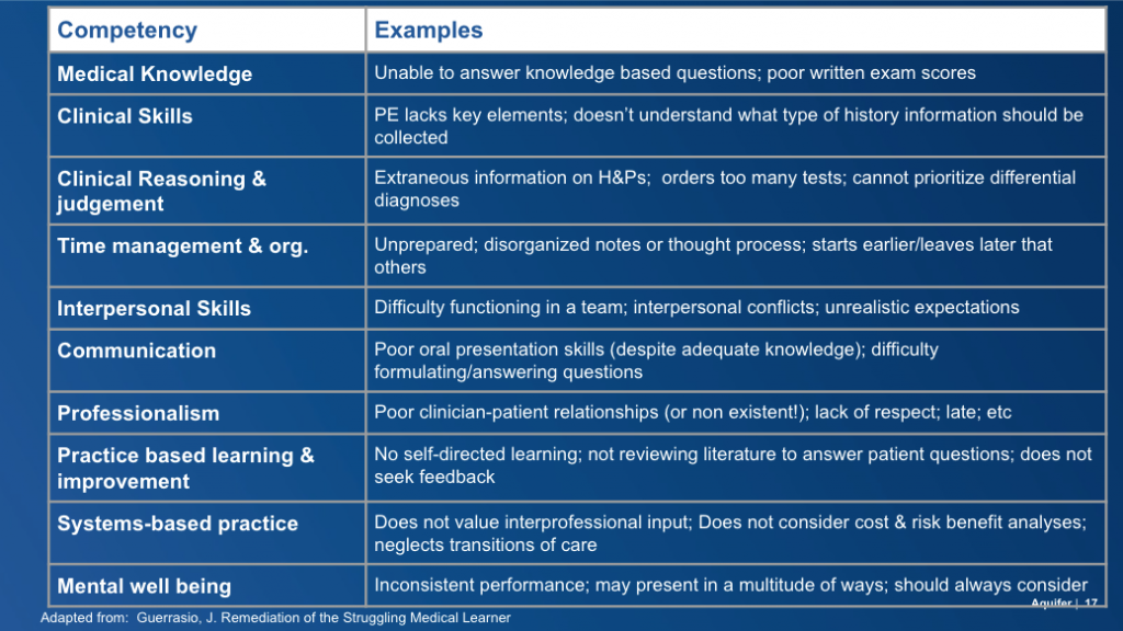I highly recommend “Remediation of the Struggling Medical Learner”, by Jeannette Guerrasio. The author presents an incredibly helpful structure for diagnosing learner issues, thinking about each competency for residency (plus mental well-being), with examples of the types of problems learners encounter.