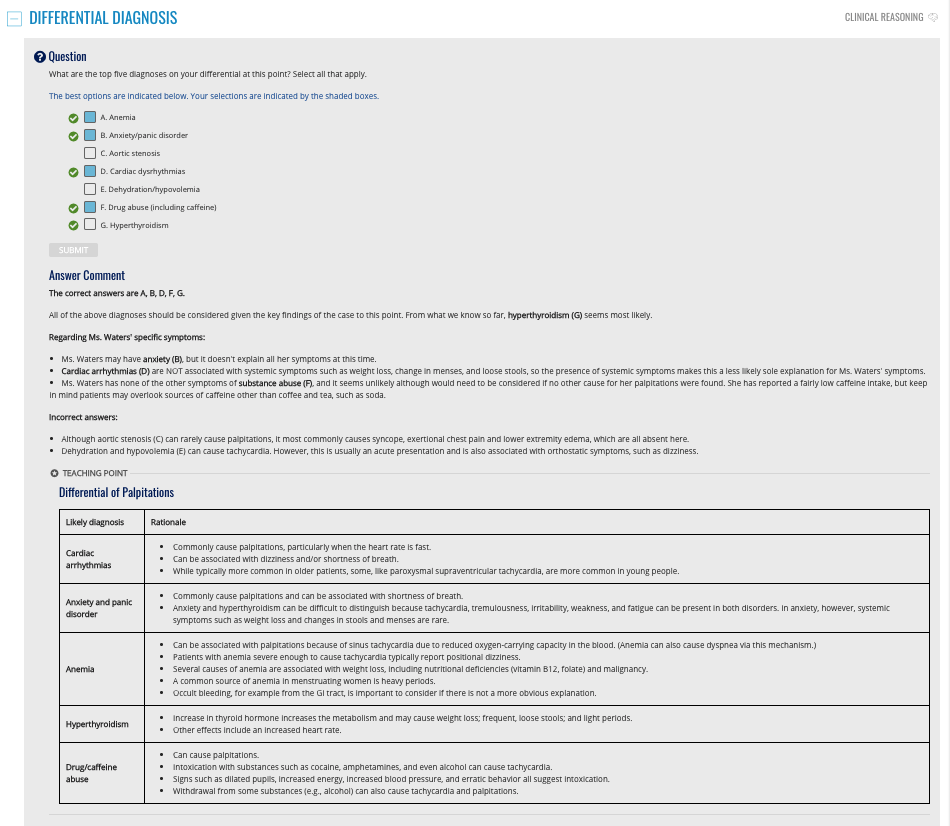 - Differential Diagnosis Questions & Tables: Most cases include a question requiring students to create a differential diagnosis. After submitting their answer, students view the correct answer with an explanation and teaching on each condition in the differential. You can work through the differential diagnosis and drill down on what they do and don’t know in a coaching session. View example.