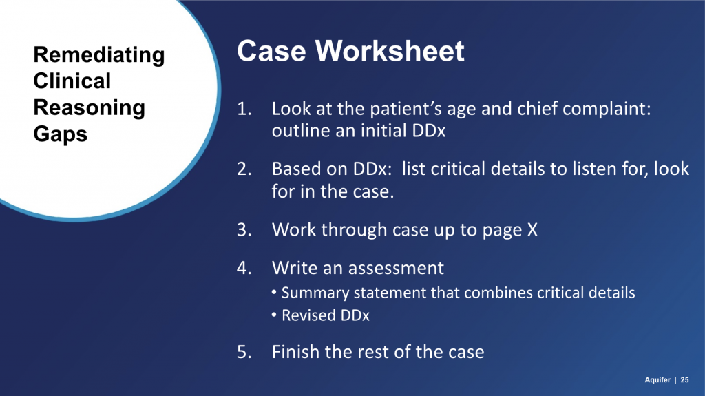 Whether you’re looking for materials to help learners develop clinical reasoning skills, new ways to structure coaching sessions, or ideas to diagnose gaps in skills or knowledge, Aquifer cases can support your remediation efforts.