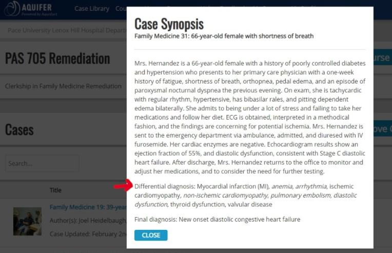 “When I’m choosing cases, I always look at the case synopsis, which shows the differential diagnosis associated with each case. Even if the final diagnosis doesn’t match up to something that they missed on the exam, the Aquifer cases are so thorough in terms of evaluating differentials that I think the case is still really helpful exercise–and the students do too,” says Kindred. “For students who don’t pass the end of rotation exams, I also meet with them and to review their summary statements, and talk about the cases. The students really get a lot out of the cases, I think it is more real for them because it is case-based and about a ‘real’ patient, which helps the information stick with them.”