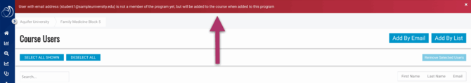 2. If you receive a message saying User(s) with the email address(es) (email1@sample.edu) is not a member of the program yet, but will be added to the course when added to this program, it means the system does not recognize those emails as having been previously rostered. Check to see that you entered the email addresses correctly. If so, contact your Program Service Administrator to ask to have the users rostered in Aqueduct. Once they have been rostered in Aqueduct, they will automatically be added to the course.