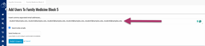 2. Insert comma-separated email addresses into the open field. It is recommended that you have a list of student emails in a column list (in Excel), which you can simply copy and paste into Aqueduct.