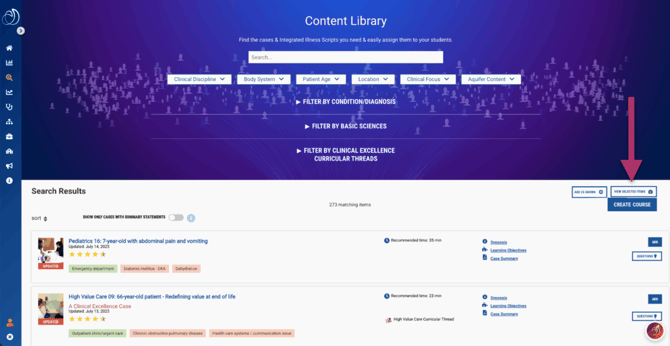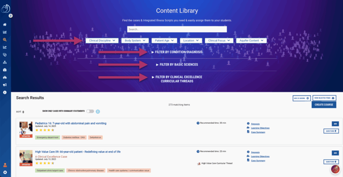 2. Use the Searchable Content Library filters to select the cases and/or Integrated Illness Scripts you would like to add to your course. Note: Skip this step if you want to create the course shell first and add cases later, or create an exam roster.