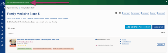 6. You will then see a notification of successful course creation. On your new course page, you will see your course information at the top and the content you have selected showing below.