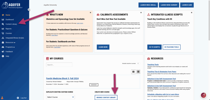 1. From your landing page in Aqueduct, click on the Content Library from the left-hand navigation panel or the My Courses card.