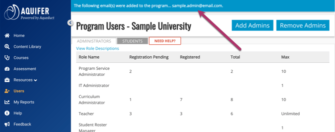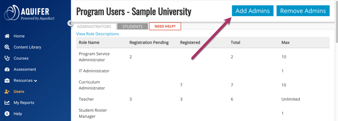 Each program has complete control over how to manage administrative users in Aqueduct. The system is designed for flexibility to best fit your program's needs. You can choose which users view reports, add student rosters, and access student data.