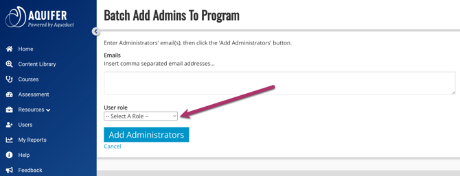 Once you have entered your email address(es), choose the User Role that you wish to assign to this group of users from the drop-down menu and click the Add Administrators button.